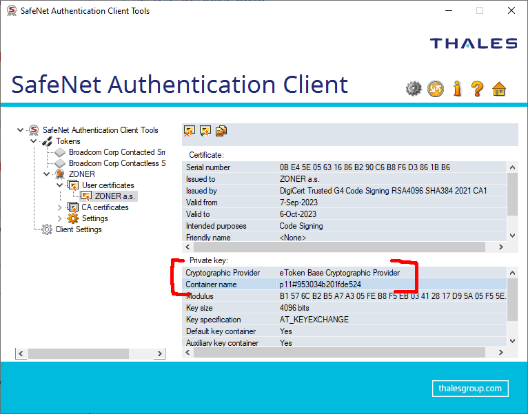 - /csp - Cryptographic provider neve(a) - megtalálja a Safenet private key szekcióban, pl. eToken Base Cryptographic Provider"